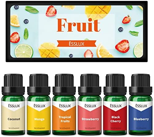 Aceites Esenciales de Frutas para Aromaterapia, ESSLUX Aceites Esenciales de Frutas Premium para Difusor(Arándano, Coco, Frutas Tropicales, Mango, Fresa, Cereza Negra),6x 10 ml