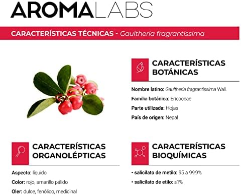 Aceite esencial de Gaulteria Olorosa 100% Natural y Bio, fruta de cultivo ecológico, certificado Ecocert (FR-BIO-01). Análisis cromatográfico efectivo por nuestros laboratorios certificados. Esto significa que este aceite esencial se prueba en el laboratorio antes de ser envasado por nosotros. El propósito de esta maniobra es asegurar que las moléculas contengan suficientes moléculas para ser efectivas. De hecho, un aceite esencial no tendrá el mismo poder dependiendo de su carné de identidad molecular. Aroma Labs se compromete a ofrecer solo aceites esenciales de alta calidad y alta eficiencia. Aroma Labs es una marca francesa preocupada por respetar tu salud y la salud del planeta. Ingredientes Aceite esencial garantizado 100% puro, natural, sin cortar, ORGÁNICO garantizado sin pesticidas. Advertencia de seguridad Un aceite esencial es un producto que debe usarse con cuidado. Siempre consulte a un médico si tiene alguna duda sobre el uso de un aceite esencial o si está tamando medicamentos al miso tiempo. Uso no recomendado para mujeres embarazadas y lactantes, niños menores de 6 años, personas con epilepsia o asma. No aplicar aceite esencial en las mucosas (ojos, oídos, nariz, etc.). Realice siempre la prueba de alergia antes de usar un aceite esencial: aplique 2 gotas en la cavidad del codo y espere 48 horas. Respete las precauciones de uso, las vías de uso, las dosis prescritas y las duraciones de uso.