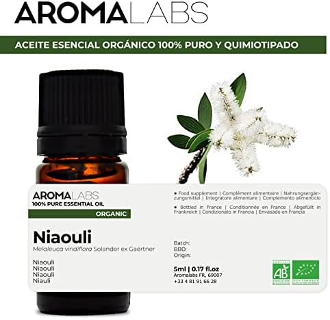 Aceite esencial de Niauli 100% Natural y Bio, fruta de cultivo ecológico, certificado Ecocert (FR-BIO-01). Análisis cromatográfico efectivo por nuestros laboratorios certificados. Esto significa que este aceite esencial se prueba en el laboratorio antes de ser envasado por nosotros. El propósito de esta maniobra es asegurar que las moléculas contengan suficientes moléculas para ser efectivas. De hecho, un aceite esencial no tendrá el mismo poder dependiendo de su carné de identidad molecular. Aroma Labs se compromete a ofrecer solo aceites esenciales de alta calidad y alta eficiencia. Aroma Labs es una marca francesa preocupada por respetar tu salud y la salud del planeta. Ingredientes Aceite esencial garantizado 100% puro, natural, sin cortar, ORGÁNICO garantizado sin pesticidas. Advertencia de seguridad Un aceite esencial es un producto que debe usarse con cuidado. Siempre consulte a un médico si tiene alguna duda sobre el uso de un aceite esencial o si está tamando medicamentos al miso tiempo. Uso no recomendado para mujeres embarazadas y lactantes, niños menores de 6 años, personas con epilepsia o asma. No aplicar aceite esencial en las mucosas (ojos, oídos, nariz, etc.). Realice siempre la prueba de alergia antes de usar un aceite esencial: aplique 2 gotas en la cavidad del codo y espere 48 horas. Respete las precauciones de uso, las vías de uso, las dosis prescritas y las duraciones de uso.