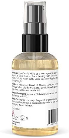 El aceite corporal y de masaje Clearly HEAL está elaborado con una mezcla única de aceites naturales y esenciales que hidratan los tejidos dañados para relajar los músculos doloridos. Extremadamente hidratante y de rápida absorción, HEAL suaviza la piel y proporciona un alivio rápido sin dejar residuos grasos. Utilice HEAL durante un masaje, como aceite corporal o agregándolo al agua del baño para relajar el cuerpo y la mente.