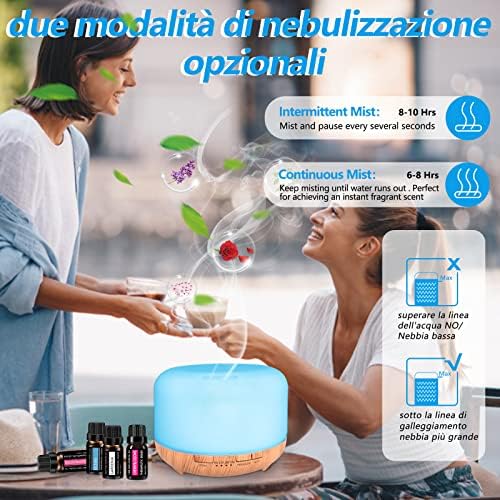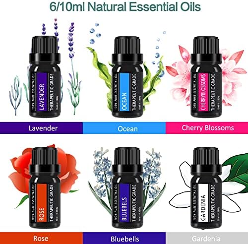Difusor con set de aceites: el producto incluye un difusor de aceites esenciales de 450 ml y 6 botellas de 10 ml de aceites esenciales de alta pureza, a sable, flor de cerezo, gardenia, campanilla, lavanda, rosa y océano. Este difusor viene con un juego de aceites esenciales, una excelente y práctica idea para regalar.