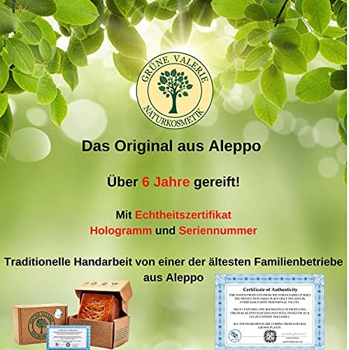 🌿 Satisfacción 100% garantizada: ♥ Muchas personas de todo el mundo encuentran el camino hacia su belleza natural a través de los jabones de Alepo originales de Grüne Valerie. ¡Si eres una de las pocas excepciones en las que no funciona, siempre puedes contactarnos y devolveremos inmediatamente el precio total de la compra! ¡Y ni siquiera tienes que devolvernos el producto! ¿Increíble? En realidad no, con nosotros el cliente ♛ ¡siempre seguirá siendo el rey! ♛