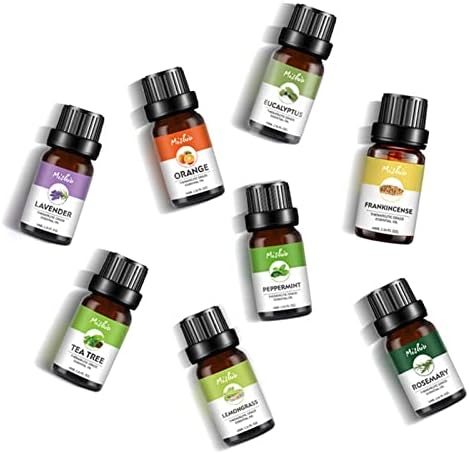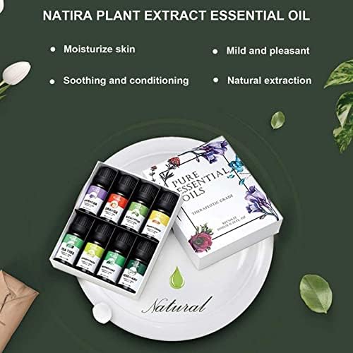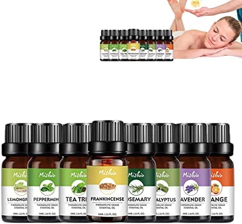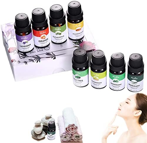 El Set de Aceites Esenciales contiene 8 botellas individuales de 10ml con 8 fragancias. Seguro y beneficioso para usar extractos de plantas naturales. Se puede utilizar para aromaterapia, difusión, masajes, kits de entrenamiento de aromas, cuidado de la piel y bricolaje de belleza.