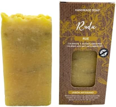 Jabón suave y cremoso, desde luego la mejor apuesta para limpiar, calmar y cuidar la piel. PASTILLA DE JABÓN DE RUDA: La ruda ha sido una de las plantas más utilizadas a lo largo de la historia por sus fantásticas propiedades calmantes para la piel así como por multitud de usos esotéricos al asociarse con energía limpia y buena salud suerte. Los jabones de ruda son elaborados a partir de infusiones, planta seca, esencias, hojas, todas de esta planta tan aromática como es la ruda. Sus propiedades regeneritas ayudan contra el envejecimiento prematuro, manteniendo la piel clara y limpia. Sin ingredientes sintéticos, ni detergentes agresivos, ni sustancias con alérgenos.