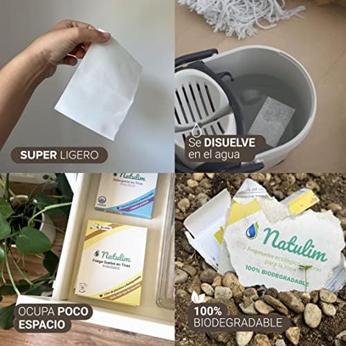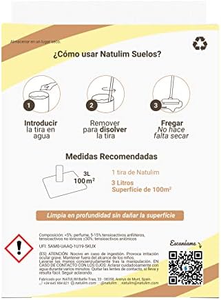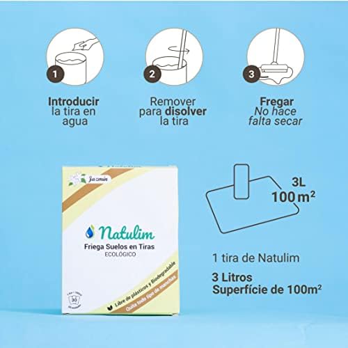 Natulim Fregasuelos es un fregasuelo ecológico con olor a Jazmín que lava el suelo igual o mejor que los productos tradicionales. Formulación ultraconcentrada y libre de ingredientes rellenos. Ofrece una limpieza completa en todo tipo de suelos incluyendo madera, parquet, mármol… Además es compatible con todo tipo de aspiradoras (incluida la Romba Conga). ¡Tendrás limpio y desinfectado el suelo de tu casa en cuestión de segundos! Muy fácil y cómodo de usar. Con una sola tira limpiará y desinfectará hasta 100m² de superficie. (También puedes partir de la tira en trocitos mas pequeños si solo quieres lavar una habitación por ejemplo). Su formato de tira reduce el volumen que ocupa, por lo que su embalaje en caja es más ergonómico que el tradicional. El friegasuelos de Natulim ocupará menos espacio en tu casa y será mucho menos pesado y mucho más óptimo para el transporte (incluso te podrás llevar de viaje). ¡La tierra estará lista en solo unos minutos! Gracias a no contener ingredientes rellenos, se logra un secado más natural y rápido que los productos tradicionales. Los clásicos friegasuelos utilizan en sus productos un formato líquido que contiene gran cantidad de componentes innecesarios y exceso de agua. Gracias al formato en cajitas de Natulim logramos deshacernos de los envases de plástico, que a pesar de que son «reciclables», solo el 20% termina siendo realmente reciclado, el resto termina en mares y vertederos porque el costo del reciclaje es demasiado alto. Nuestro embalaje no utiliza nada de lástic y es 100% biodegradable, por lo que contamos con un friegasuelos Zero Waste y eco-friendly. Además, la caja de Natulim pesa menos de 100g, lo que frente a una botella de fuel oil habitual, ayuda a reducir el consumo de combustible y las emisiones de CO2 en su transporte. Este producto, no solo cuida del medioambiente, sino que también es 100% vegano, ya que no se han usado ingredientes animales para la producción ni en el testeo.