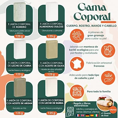 🌱【TRABAJO CON INGREDIENTES ORGÁNICOS】: Nuestro paquete de huesos contiene: 1 x Jabón para el cuerpo de leche de Burra (125g), 1 x Jabón para el cuerpo de aceite de Olive (125g), 1x Jabón para el cuerpo de leche de Cabra (125g), 1x Jabón para el cuerpo de Romero (125g), 1x Jabón para el cuerpo de aceite de almendras dulces (125g), En total son 15 productos de higiene que te permitirán economizar a la vez que te cuidas para nuestro planeta.