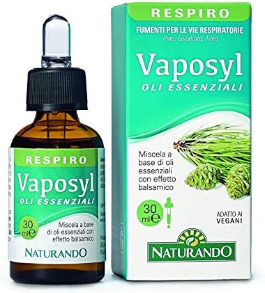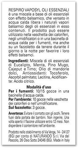 Vapozilo – 30 ml. Una mezcla de aceites esenciales con efecto balsámico, en agua caliente libera los vapores balsámicos naturales de los aceites esenciales contenidos en ella. El producto se puede utilizar en el calentador, en humidificadores o en agua caliente para fumigación, en la almohada o el ñuelo. Para fumigación: 10/15 gotas en un golpe de agua caliente; Para el ambiente: 10 gotas en el disipador de calor o en el humidificador; Sobre la bufanda o la almohada: 3 gotas. Advertencias: Evitar el contacto con los ojos. Mantener fuera del alcance de los niños. Sin rastro. Una vez abierto, el frasco debe utilizarse en un plazo de 12 meses. No dispersar el envase en el ambiente.