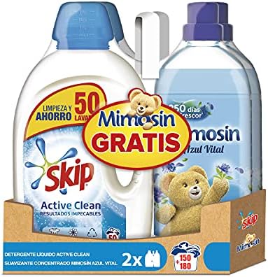 ¡Prueba el Pack Skip Líquido Active Clean 50 lavados + Mimosin Azul Vital 60 lavados! Su fórmula con aceleradores de lavado es más eficaz contra las manchas, especialmente de grasa. El lavado en ciclos cortos (30 minutos) te permite ahorrar agua y electricidad. Además, esta fórmula ahorra tiempo con su eficacia incluso en lavados cortos. La fórmula de Skip Líquido se disuelve instantáneamente y penetra en el corazón de la ropa para obtener resultados impecables. Especialmente diseñado para el cuidado de tu ropa. Skip Líquido Active Clean quita las manchas de tu ropa respetando sus fibras y colores. Ideal para lavar a baja temperatura, su acción quitamanchas elimina fácilmente las manchas difíciles y la suciedad sin desgastar los colores y respetando las fibras de tu ropa.Y con Active Clean descubrirás una sensación de frescor y lavado que durará hasta el próximo lavado. : Sensación de recién lavado Active Clean – Todos los niños tienen derecho a ser niños, derecho a descubrir el mundo por sí mismos… y son libres de ensuciarse. con laSkip, ya no tienes que preocuparte por las manchas. Descubre Mimosin Azul Vital, un suavizante concentrado que consigue proteger tu ropa de los malos olores. Mimosin Azul Vital brinda una sensación de frescura 100% duradera, para que tu ropa mantenga una agradable fragancia por más tiempo. Es un producto que suaviza las fibras, evita su rigidez y hace que la ropa sea mucho más agradable al tacto. Pero Mimosin Azul Vital es mucho más que un suavizante. con la película lubricante Mimosin, las fibras de tu ropa rozan menos entre sí, minimizando los daños y el consiguiente efecto pelusa. La película de lubricante hace que tu ropa no se arrugue tanto durante el lavado, facilitando así el posterior ironchado. Mimosin ayuda a pservar los colores y el brillo de tu ropa eviento la discoloración de las prendas. El suavizante de telas Mimosin Azul Vital también acorta el tiempo de secado de tu ropa, reduciendo la cantidad de agua retenida en la ropa después del ciclo de centrifugado. Agregar suavizante de telas a tu ropa es muy fácil. Las botellas de Mimosin incluyen un pequeño capón dosificador. Vierta el suavizante de telas en la tapa siguiendo las instrucciones de la botella. Vierte Mimosin en el cajetín correspondiente, elige un programa de lavado y deja que tu lavadora se ocupe del resto. El suavizante para la ropa se ajeda en el ciclo final para dar suavidad y la fragancia a tu colada. Una vez lavada la ropa, asegúrese de que esté completamente seca. Tender la ropa y dejar que se seque al aire contribue a optimizar el frescor duradore de los suavizantes Mimosin.