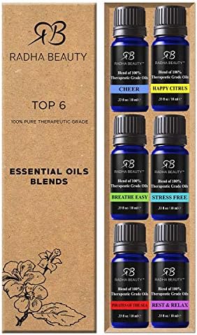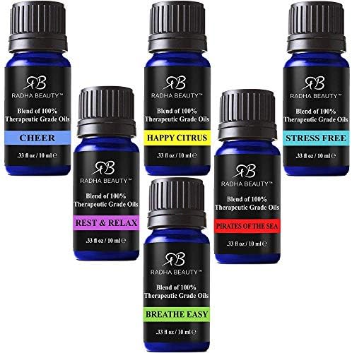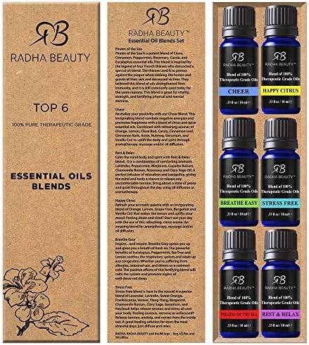 Radha Beauty Set de mezclas de aceites esenciales y kit natural para aromaterapia, mar de ladrones, sin estrés, descanso y relajación, respiración fácil, alegría, cítricos felices Pack de 6