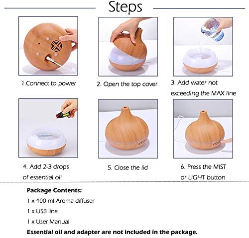 1 x difusor de aroma de 400 ml 1 x línea USB 1 x manual de usuario El aceite esencial y el adaptador no están incluidos en el paquete.